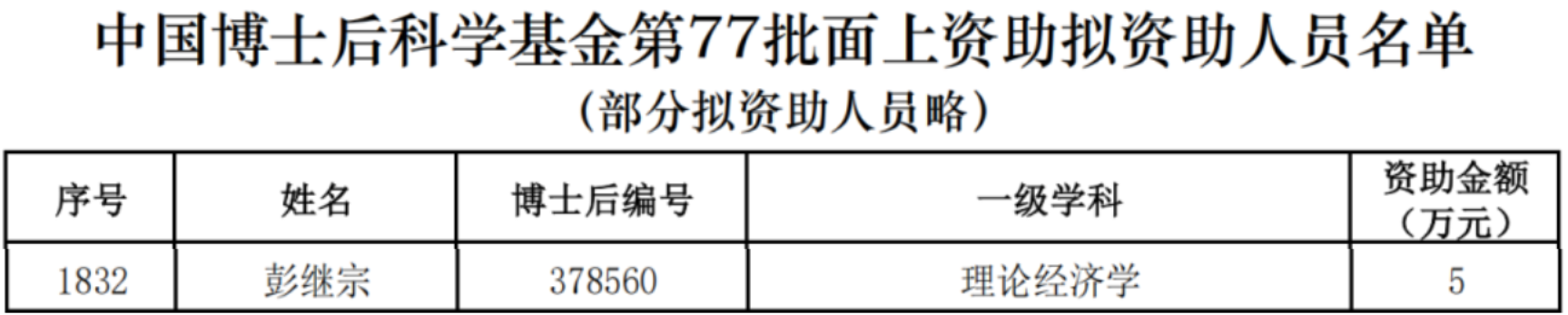 Dr. Peng Jizong from Our School was Awarded General Funding of the 77th Batch of China Postdoctoral Science Foundation