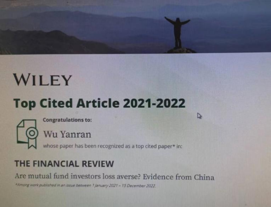 近期,Wiley出版社和美国东部金融协会主办的期刊The Financial Review(ABS三星)发布通知,我院江婕老师(第一作者)和伍燕然老师(通讯作者)发表的论文“Are mutual fund investors loss averse? Evidence from China” 成为2021至2022年度基金投资领域引用次数最多的论文之一(引文数据来自Clarivate Analytics)。论文在线发表于2020年9月,正式出版时间为2021年5月。