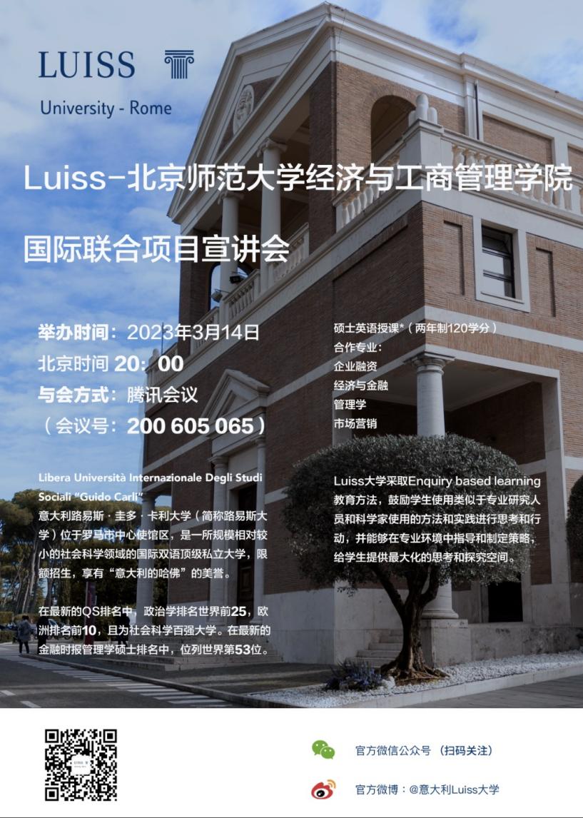 我院经济、金融、会计、市场营销、工商管理、国际贸易专业大三学生,经过项目遴选,被意大利LUISS大学录取后,大四上学期可以前往LUISS大学继续修读两年硕士课程。可修读的专业包含企业融资、经济与金融、管理学、市场营销。本项目学习基本年限为5年。学生在第4年赴LUISS大学学习期间须远程完成北师大学士学位论文开题及答辩的相关要求。顺利完成项目的学生,可获得北师大毕业证书及学士学位证书,同时获得LUISS大学硕士学位证书。