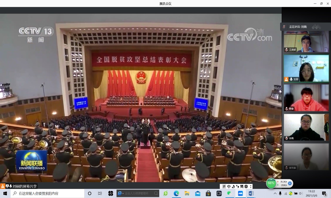孔祥奕同学将脱贫攻坚与全面实施乡村振兴战略相结合,以自己家乡曹县淘宝村的“汉服”产业为例,讲述了脱贫过程中遇到的困难及克服困难的办法,同时他号召大家将自身的专业背景运用于乡村振兴之中,用自己的知识和能力为乡村的发展贡献一份力量。王紫同学分享了自己参加“精准扶贫”调研的收获,她以自己的家乡四川为背景,对石溪镇的一些贫困户进行了调研,深刻感受到扶贫应与扶智相结合,并提出了自己关于精准扶贫措施的一些思考,比如激发贫困群众脱贫内在动力、借助“互联网+文化”加大教育投入力度、加快贫困地区教育发展、适当培育科技扶贫龙头企业等。李艺华同学谈到脱贫摘帽不是终点而是新生活奋斗的起点,身为新时代青年的我们,应当发扬脱贫攻坚精神,积极参与支教下乡等活动,宣传家乡脱贫成果,将祖国的发展落实到自身的责任担当。