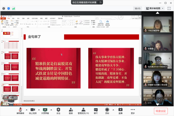 共同学习过后,支部成员踊跃发言,结合自身实际经历畅谈心得感悟。袁胜轩同学指出在扶贫的带动下的乡村既有共性又有个性,既有党的领导关怀,又能够利用自身优势进行扶贫开发,这能够充分体现党建在扶贫中的引领作用,并且能够展现出扶贫中“精准发力”的魅力。沈苗苗同学谈到帮助贫困群众摆脱贫困、过上小康生活,是共产党员义不容辞的责任,作为党员,应当身先力行深入贫困区,走进贫困户,切实的帮助群众解决身边困难,共商脱贫脱困致富路。崔梦婷同学指出脱贫攻坚战的成功,离不开党中央正确的领导和千千万万中华儿女不懈努力和艰苦奋斗,我们也应该学习楷模们的脱贫攻坚精神,以实际行动服务人民与社会。葛艺蓉同学通过联系寒假调研经历,讲述了安徽省临泉县旅游业扶贫的成果。而这份优秀的成绩单正是党坚持以人民为中心决战脱贫攻坚的结果,也是党与人民紧密相连的结果。程玉婷同学指出在新冠肺炎疫情的巨大影响下,脱贫攻坚战任务却仍然如期完成。这是令每一个青年人骄傲,并且未来应该付出更多努力去奔赴的历史任务。