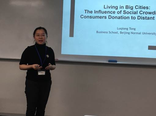 童璐琼副教授汇报了“住在大城市:社会拥挤对消费者远距离捐赠的影响”。她指出捐赠者与捐赠活动的距离对慈善行为有较大的影响,消费者倾向于对空间距离较近的受助者提供帮助。她通过实验的方法,研究社会拥挤对捐赠活动的影响。实验结果表明,拥挤程度显著降低了近距离捐赠行为的概率,提高了远距离捐赠行为的概率。在大城市日益拥挤的环境下,该研究对消费者亲社会行为的了解有重要意义。未来的研究可通过田野实验,对社会拥挤的作用机制进行进一步探究。
