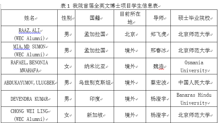 国际发展英文博士项目是学院第一届全英文博士项目,经过筛选,招收了六位博士生,分别来自孟加拉国、纳米比亚、乌兹别克斯坦、新加坡、印度等五个国家,其中三位是我院“世界经济与中国”全英文硕士项目的毕业生。首届项目的六位博士生信息如下: