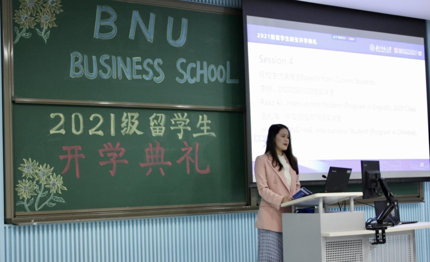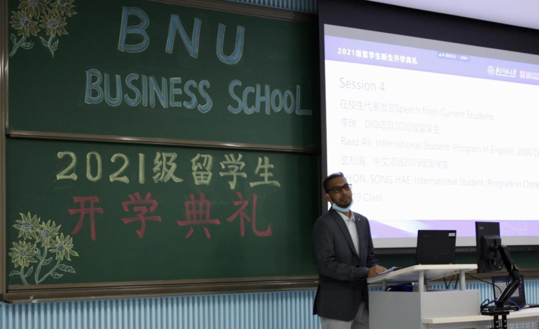 在在校生发言中,2020级英文项目博士生代表Raaz Ali(巴基斯坦籍)介绍了自己自硕士阶段起在北师大的求学经历,鼓励同学们在这个充满学术氛围和人文关怀的环境里充分挖掘自己的潜力,努力成为一名连结中国与自己母国的信使。2019级中文项目留学生玄松海(朝鲜籍)分享了自己在北师大学习与生活的经验,她希望新同学们在新环境中照顾好自己,学会理解与关爱,学会互补与交流。把握来之不易的学习机会,树立远大理想,立足学科前沿知识,并积极探索。