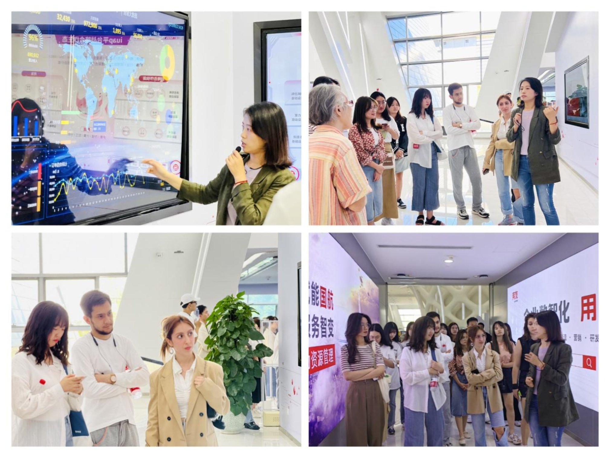最后,张老师带留学生团参观了不同领域的数字转型展厅。在不同展厅,留学生们都可以看到各行各业在数字化转型之后的样品和模型。展厅展现了不同行业的程序和产品,其中包括教育、政务、医疗、金融、广信、资源等行业。同学们表示,参加此次企业参观,不仅增长了对数字化的知识,同时也亲身体会到了数字化所带来的便利。