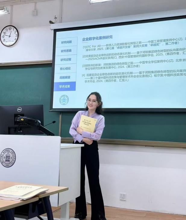 MBA教育以实践为核心,而孙杨的学术之路始于一次偶然的文献阅读。“一天晚上做市场营销作业时,我在朋友圈分享《管理世界》的一篇文章,周老师看到后稍感惊讶,同时鼓励我结合工作经验深入探索,这成为我参与案例开发的起点。”在导师引导下,在我院MBA“实践反哺理论、学术赋能应用”的培养教育思路中,她用“OTC For All——联想人力资源数智化转型之旅”“场景驱动企业绿色创新的动态演化机制”等实战课题,躬身实践“知行合一”的理念。