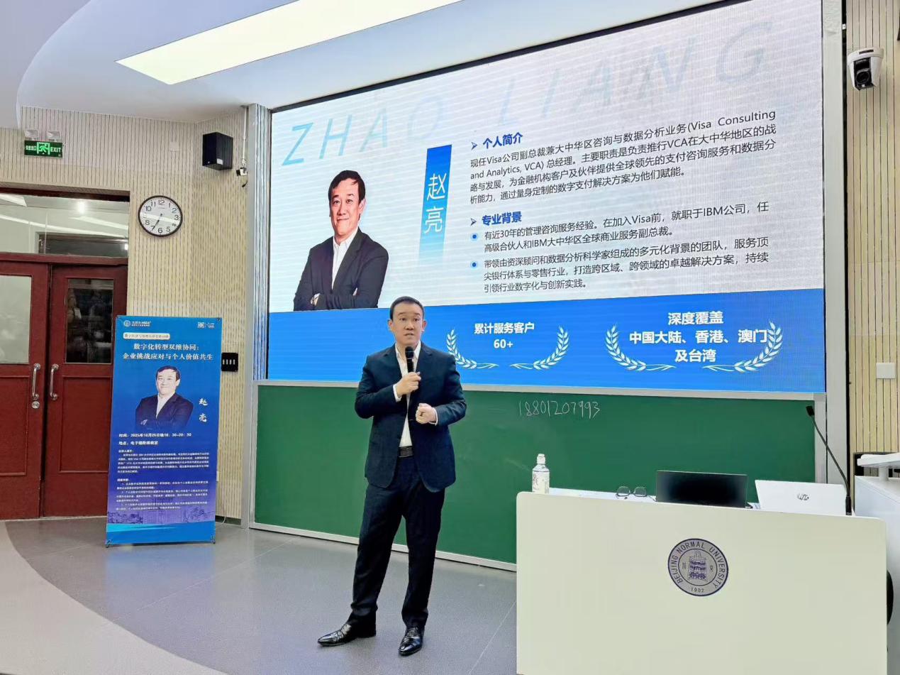 2025年10月25日晚,91在线 “数字经济与管理大讲堂”第49讲《数字化转型双维协同:企业挑战应对与个人价值共生》在电子楼阶梯教室举办。本次讲座特邀Visa 公司副总裁兼大中华区咨询与数据分析业务总经理赵亮主讲。91在线 陈夙老师主持讲座,150余位学院本、硕、博学生到场聆听。