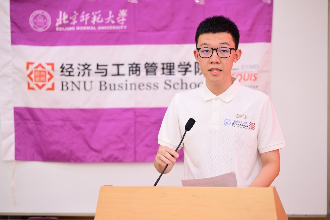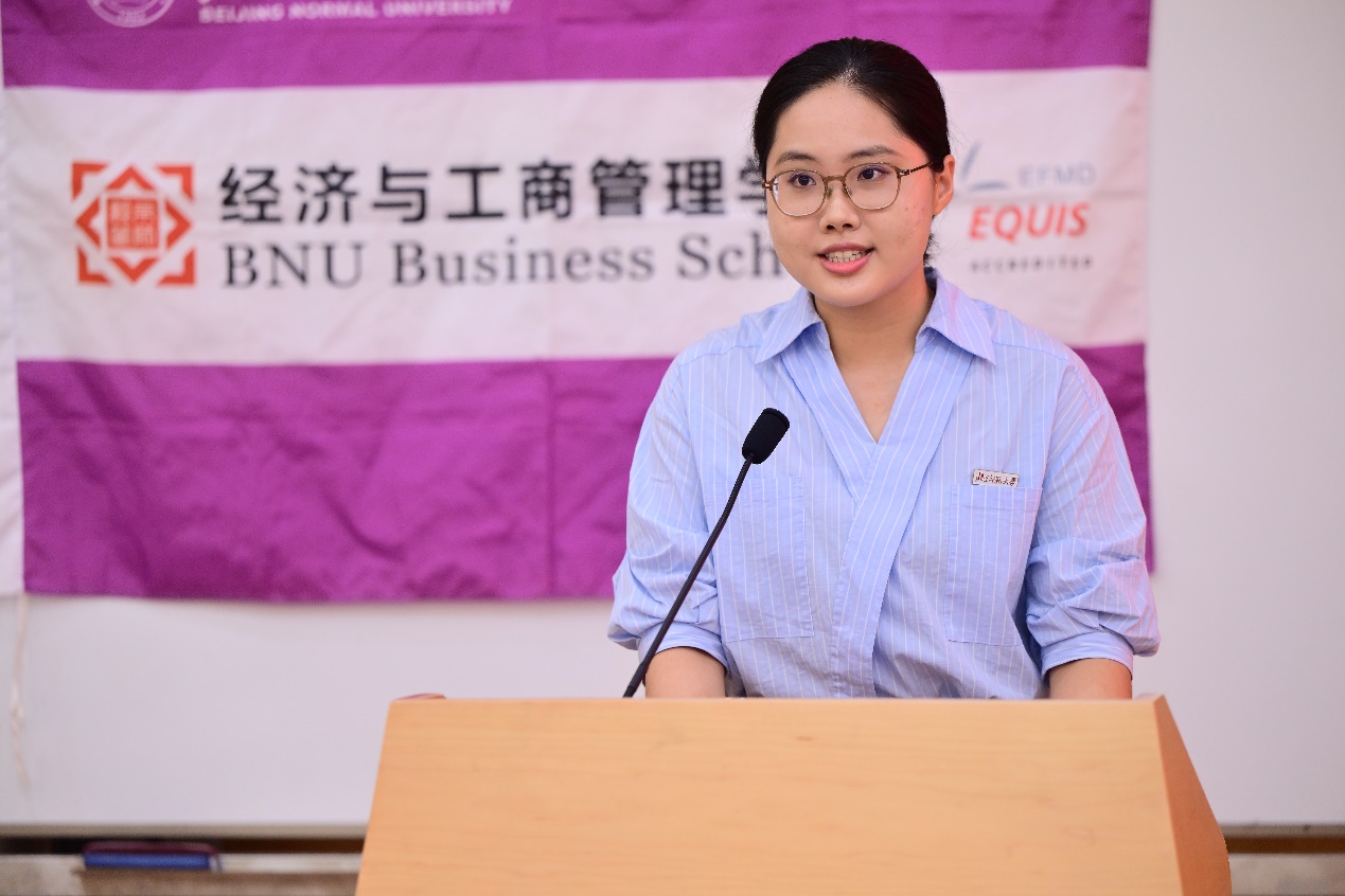 学校财经处处长、学院国际经济与贸易系蔡宏波教授作为教师代表发言。蔡老师在致辞中,明确指出同学们肩负着双重身份:既是传承百年师范荣光与教育报国传统的“北师大人”,又是兼具理性思维与经世济民责任感的“经管人”。他通过分享学院前辈陶大镛先生为国为民做经世致用之学的坚定信念、王善迈先生的家国情怀与求真求实的治学精神,以及一位北师大经管学子毅然扎根西部基层的三则故事,生动展现了北师大经管人始终秉持的家国担当、心系民生与甘于奉献的深厚情怀。他希望同学们能将经济学的理性精神与师范院校的人文关怀深度融合,既有理性之眼,又有仁爱之心,既能构建模型精通算法,又能深入社会解决问题。